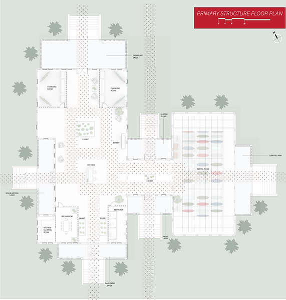 This project is centered on an abandoned complex off the North Shore of Oahu The program will be inserted into the shell of the remaining structures as renovating what remains. One primary goal is to preserve the building while creating a space of discovery for both locals and tourists to experience. it is intended for one to enter with their own perception of what to expect, throughout their time to begin formulating that thought within the experience and at the end reach a discovery whether be freedom, a feeling, or a spiritual connection. The program is to serve as a hub for people to come to and be taken throughout the island on different explorations (including surfing, hiking snorkeling, caving, and more) then be brought back for reflection. This location would provide the transportation and rental equipment needed. The program allows visitors the ability to create their own experiences with fully customary options. Through integration within multiple different activities within nature, these experiences are provided to entice wonder of formation, and how it all came to be.